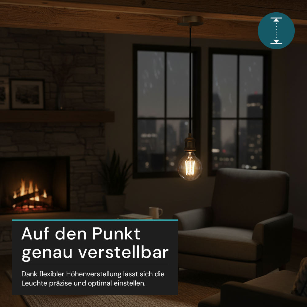 - Hochwertige Materialien: Die Fassung besteht aus robustem Metall und ist mit einem stilvollen Textilkabel ausgestattet. Dies verleiht der Lampe nicht nur eine edle Optik, sondern sorgt auch für Langlebigkeit und Stabilität.