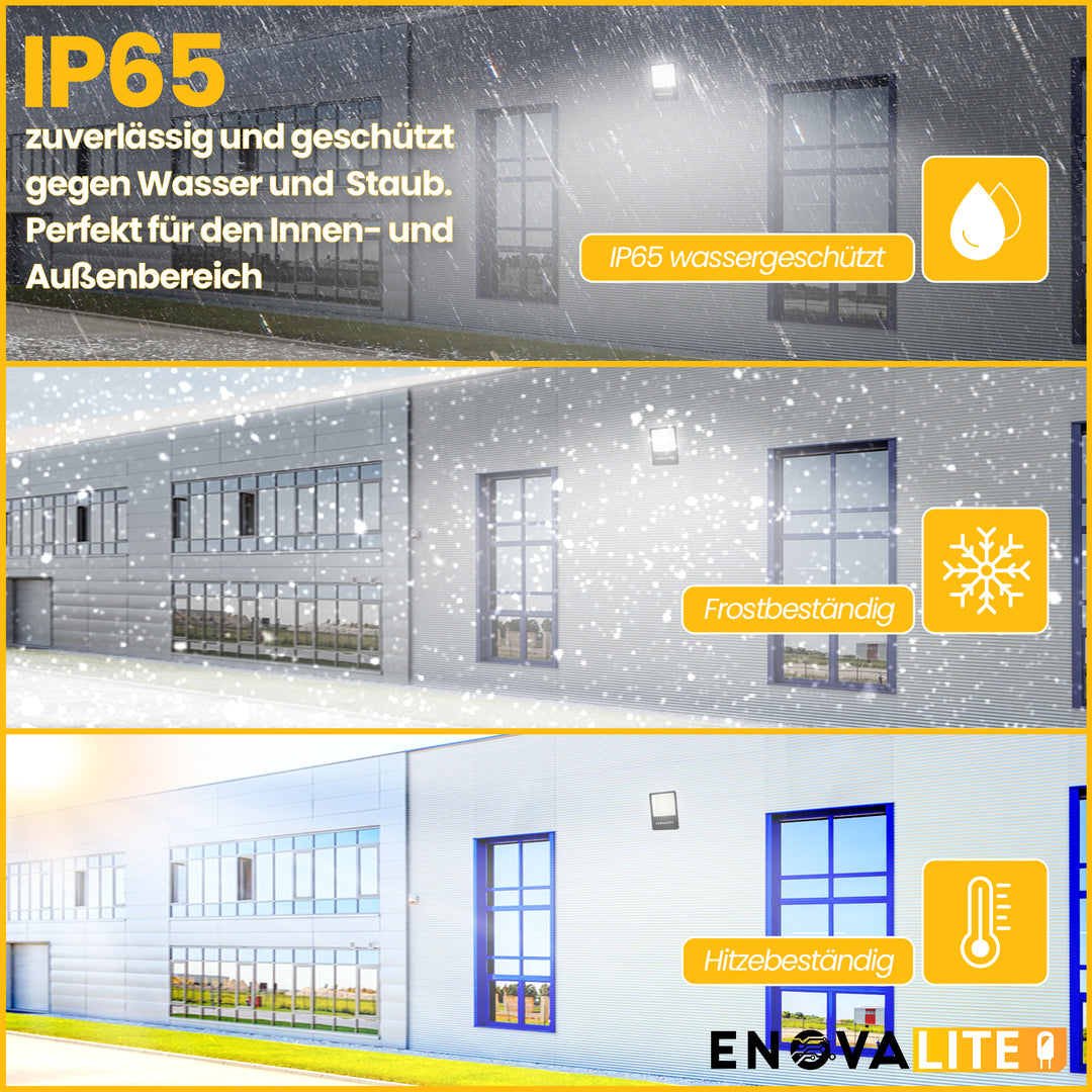 LED-Fluter, 50 W, 4000 K (neutralweiß), 6500 lm, schwarz, IP65, LUMILEDS LED Professionelle LED-Strahler, 50 W Leistung, in 4000 K (neutralweiß), 6500 Lumen, IP65 staub- und wassergeschützt, geprüfte Qualität, perfekt für Wege, Garten oder Baustelle  Extrem lange Betriebsdauer: Mit einer außergewöhnlich langen Lebensdauer von 54.000 Stunden bietet der Strahler eine langfristige Beleuchtungslösung ohne häufige Wartungs- oder Austauscharbeiten. Robust und Wetterbeständig: Der Strahler ist mit IP65- und IK06-Zertifizierungen ausgestattet, die ihn vor Staub, Feuchtigkeit und mechanischen Einwirkungen schützen. Dadurch eignet er sich perfekt für den Einsatz in verschiedenen professionellen Anwendungsgebieten. Beste Qualität: Die Verwendung von hochwertigen LEDs der renommierten Marke LUMILEDS garantiert eine erstklassige Lichtqualität mit hoher Farbwiedergabe und einer natürlichen Beleuchtung. Energiesparend und effizient: Dank modernster LED-Technologie ermöglicht der Fluter eine effiziente Beleuchtung bei minimalem Energieverbrauch.  Der ENOVALITE LED-Fluter in elegantem Schwarz ist ein qualitativ hochwertiges Beleuchtungswerkzeug für den professionellen Einsatz. Mit einem großzügigen Abstrahlwinkel von 120° und einer Farbtemperatur von 4000 Kelvin (neutralweiß) sorgt dieser Strahler für eine breite und natürliche Beleuchtung Ihrer Arbeitsumgebung. Die Leuchte verwendet hochwertige LED und bietet eine sehr hohe Energieeffizienz mit 130 Lumen pro Watt. Mit einer Lebensdauer von 54.000 Betriebsstunden kann dieser Fluter viele Jahre lang ohne Austausch oder Wartung verwendet werden. Die IP65 Zertifizierung ermöglicht, dass er gegen Staub und Wasser geschützt ist und auch bei extremen Temperaturen von -40 °C bis +50 °C verwendet werden kann. Mit einem IK06 ist dieser Lichtstrahler auch in der Lage, rauen Arbeitsbedingungen standzuhalten. Egal, der eingesetzt wird, bietet der ENOVALITE LED-Fluter bietet eine hohe Leistung und Qualität, die von einem professionellen Beleuchtungsinstrument erwartet wird. Dieses Produkt ist auch geeignet als: LED Strahler, Deckenfluter, Strahler, LED Flutlicht, Außenstrahler, Baumstrahler, Scheinwerfer Garten, Baustrahler, Lichtstrahler, Arbeitsleuchte, Flutlichtstrahler, Industrielampe, Industrieleuchte, Garagenlampe, Parkplatzleuchte, Hallenstrahler, Außenleuchte, Werkstattleuchte, Wandleuchte, Wandstrahler, Fluter, Gartenleuchte, Gartenlampe.