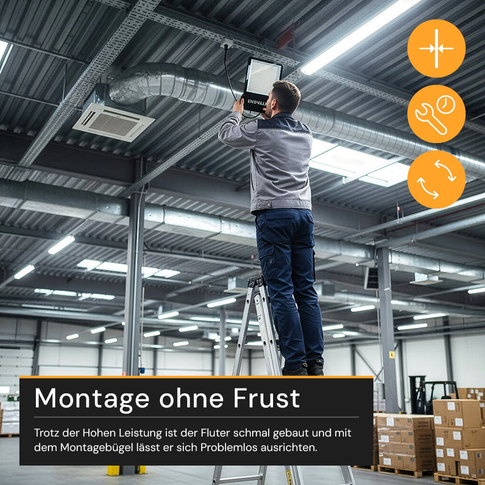 Der ENOVALITE LED Fluter 100W in elegantem Schwarz ist die ideale Wahl für alle, die eine leistungsstarke, langlebige und energieeffiziente Beleuchtungslösung für den Außen- und Industrieeinsatz suchen. Mit einem weiten Abstrahlwinkel von 120° und einer neutralweißen Farbtemperatur von 4000 Kelvin sorgt dieser LED Strahler für eine gleichmäßige, natürliche Ausleuchtung – perfekt für Werkstätten, Baustellen, Einfahrten, Lagerhallen oder Sicherheitsbereiche. Ausgestattet mit hochwertigen Lumileds LEDs erreicht der Fluter eine Lichtausbeute von 130 Lumen pro Watt, was ihn zu einem der energieeffizientesten LED Außenstrahler seiner Klasse macht. Die beeindruckende Lebensdauer von bis zu 54.000 Stunden garantiert langjährige Nutzung ohne Wartung oder Austausch. Dank der IP65 Schutzart ist der LED Fluter für den Außeneinsatz bestens geeignet: Er ist staubdicht, strahlwassergeschützt und trotzt selbst extremen Temperaturen von -40 °C bis +50 °C. Zusätzlich sorgt die IK06 Stoßfestigkeit für hohe Widerstandsfähigkeit gegen mechanische Belastungen – ideal für anspruchsvolle Umgebungen. Ob als LED Baustrahler, Arbeitsleuchte oder Sicherheitsbeleuchtung – der ENOVALITE LED Fluter überzeugt durch Qualität, Zuverlässigkeit und Lichtleistung auf professionellem Niveau.