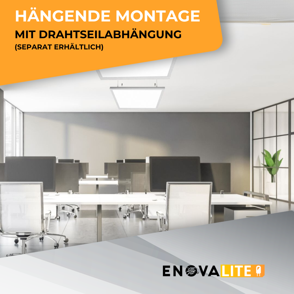 - Drahtseil-Montage: Durch ein Drahtseil-Montageset ist es auch möglich, das LED-Panel von der Decke hängen zu lassen.