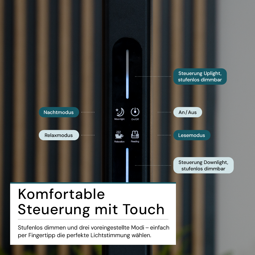 - Individuell anpassbar: Dimmbare Helligkeit via Touch-Screen-Steuerung und drei verschiedene Modi (Nacht, Relax und Lesen) für maximale Flexibilität und Komfort.