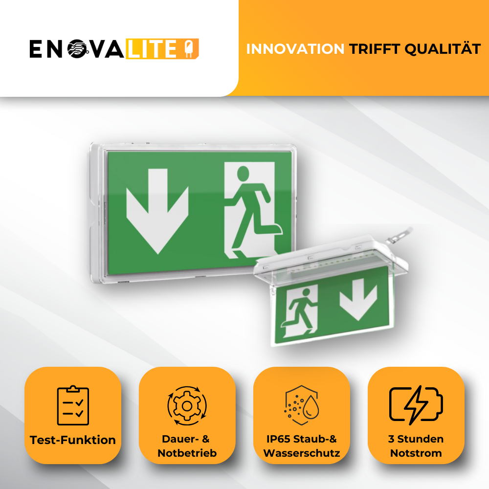 Die neue LED-Fluchtwegleuchte von ENOVA LITE ist IP65 geschützt und kann so als normale Feuchtraumleuchte oder als Fluchtwegleuchte an der Wand und an der Decke als Ein- oder Aufbauleuchte montiert werden. Das mitgelieferte Montagematerial macht dies möglich.