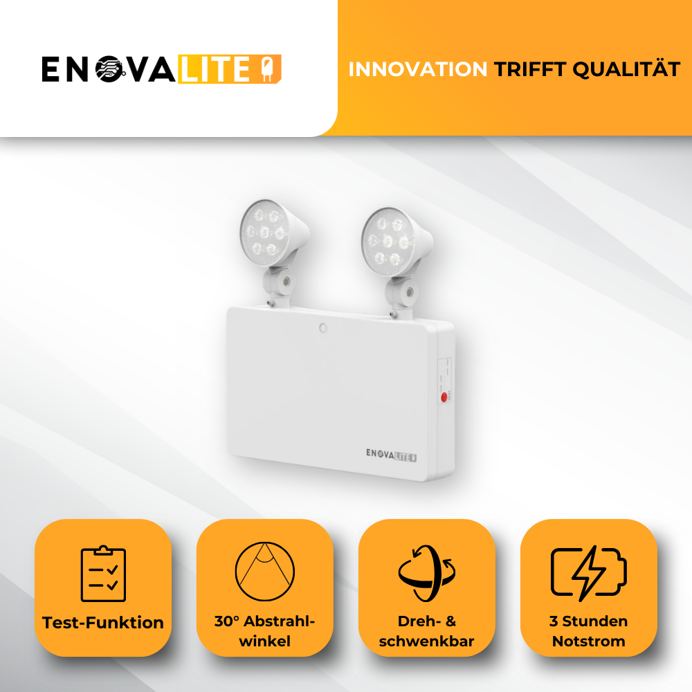 Verlassen Sie sich auf die bewährte Sicherheit und Normkonformität der LED-Fluchtwegleuchte Twin-Spot von ENOVALITE – für sichere Wege in jeder Notsituation!