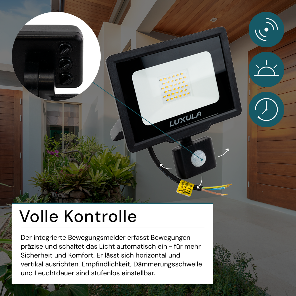 Der LUXULA Flutlichtstrahler mit Bewegungsmelder – die perfekte Beleuchtungslösung für den Innen- und Außenbereich! Mit einem eleganten schwarzen Design fügt sich dieser Fluter nahtlos in jede Umgebung ein und sorgt für eine hervorragende Ausleuchtung. Mit einem Abstrahlwinkel von 100° werden große Flächen effektiv beleuchten und dank des Bewegungsmelders wird der Fluter automatisch eingeschaltet, wenn sich jemand nähert. Die LUXULA LED-Technologie garantiert eine lange Lebensdauer von 36.000 Betriebsstunden und eine hohe Energieeffizienz von 100 Lumen pro Watt. Wählen Sie zwischen 3000 und 4000 Kelvin (warm- und neutralweiß), um die ideale Beleuchtungstemperatur für Ihre Umgebung zu finden.