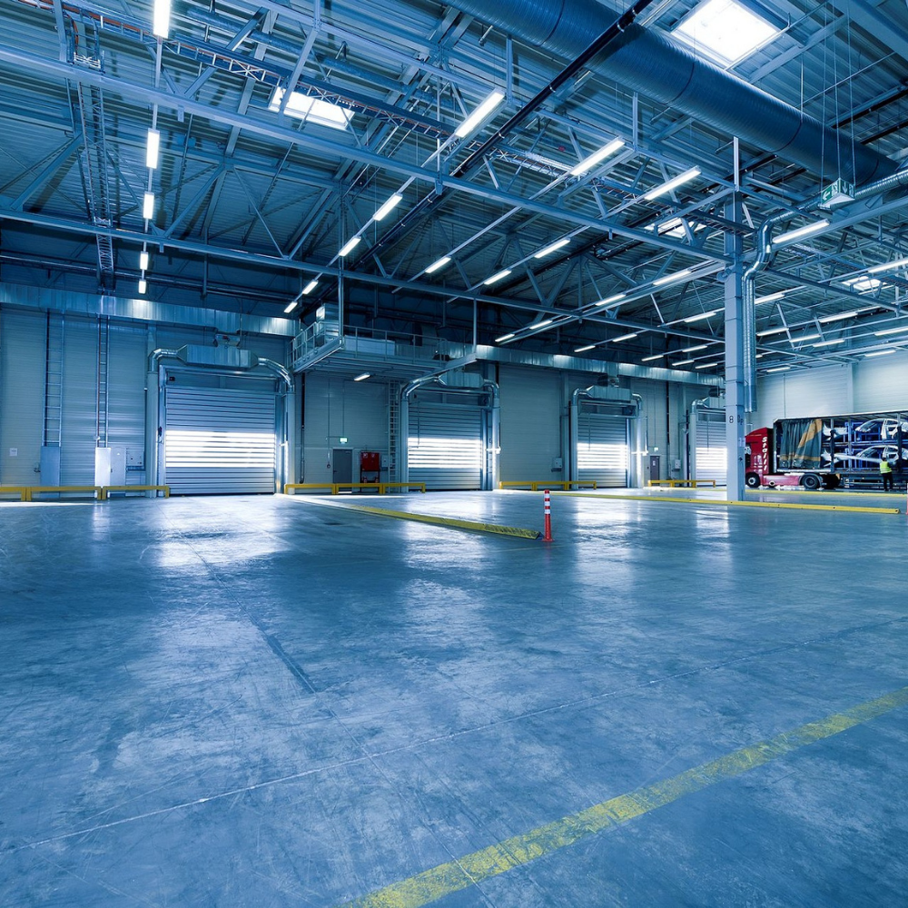 Lineare Hallenleuchten sind ideal geeignet zur Ausleuchtung von Lagerhallen mit hohen Regalreihen, aufgrund der Bauform passt sich das Licht optimal den Gängen zwischen den Regalen an.