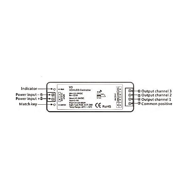 3 Kanal, Mini Controller mit konstanter Ausgangsspannung. Voreinstellung als RGB Controller. Mit RGB Fernbedienungen zu verwenden. Kann ebenfalls für CCT (Farbtemperatureinstellung) und Single Color (Dimmen) Anwendungen verwendet werden. Volle Kompatibilität mit verschiedenen Single-, Dual Color und RGB Fernbedienungen. Sanftes Dimmen und Umschalten ohne jegliches Flackern/ Flimmern. Bei Steuerung von RGB Beleuchtung verfügt der Controller über 30 Modi, inklusive statischer Farben Jump-, Blinklicht oder langsamen Farbwechsel, einstellbarer Geschwindigkeit und Helligkeit. Verfügt über 2.4GHz Funk Technologie. Es können bis zu 10 Fernbedienungen verbunden werden.Die Steuerung ist über Wlan, mittels einer App, die unter IOS oder Android installiert wurde in Kombination mit einem WiFi-Modul möglich. Der Benutzer kann eigene RGB Farbwechselmodis in den erweiterten Einstellungen des Apps erstellen.