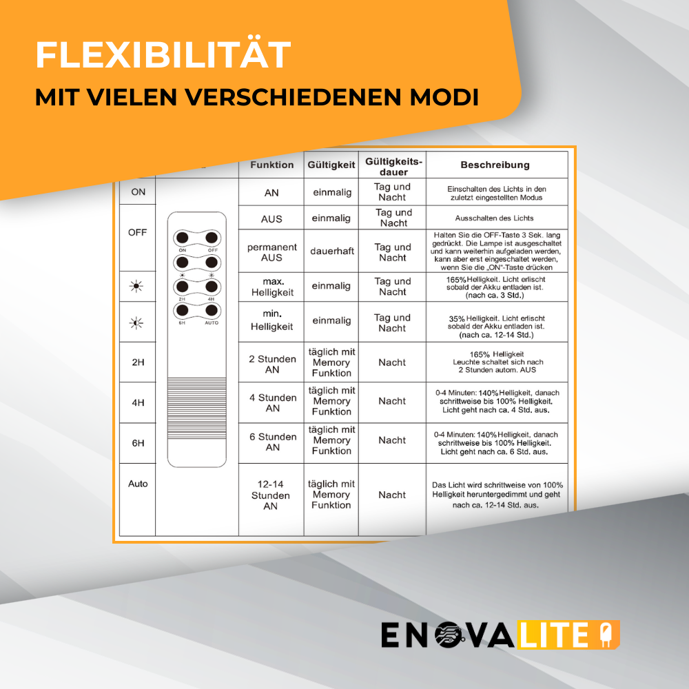 Mit einer Betriebszeit von bis zu 14 Stunden bei voller Ladung bietet die Solar-Straßenleuchte PRO eine langanhaltende Beleuchtung für Ihre Straßen- und Parkplatzbeleuchtung. Zusätzlich verfügt sie über intelligente Lichtmodi, darunter Dauerlicht und gedimmtes Licht. Wählen Sie den Modus, der am besten zu Ihren Bedürfnissen passt, und optimieren Sie so die Beleuchtung für unterschiedliche Situationen.