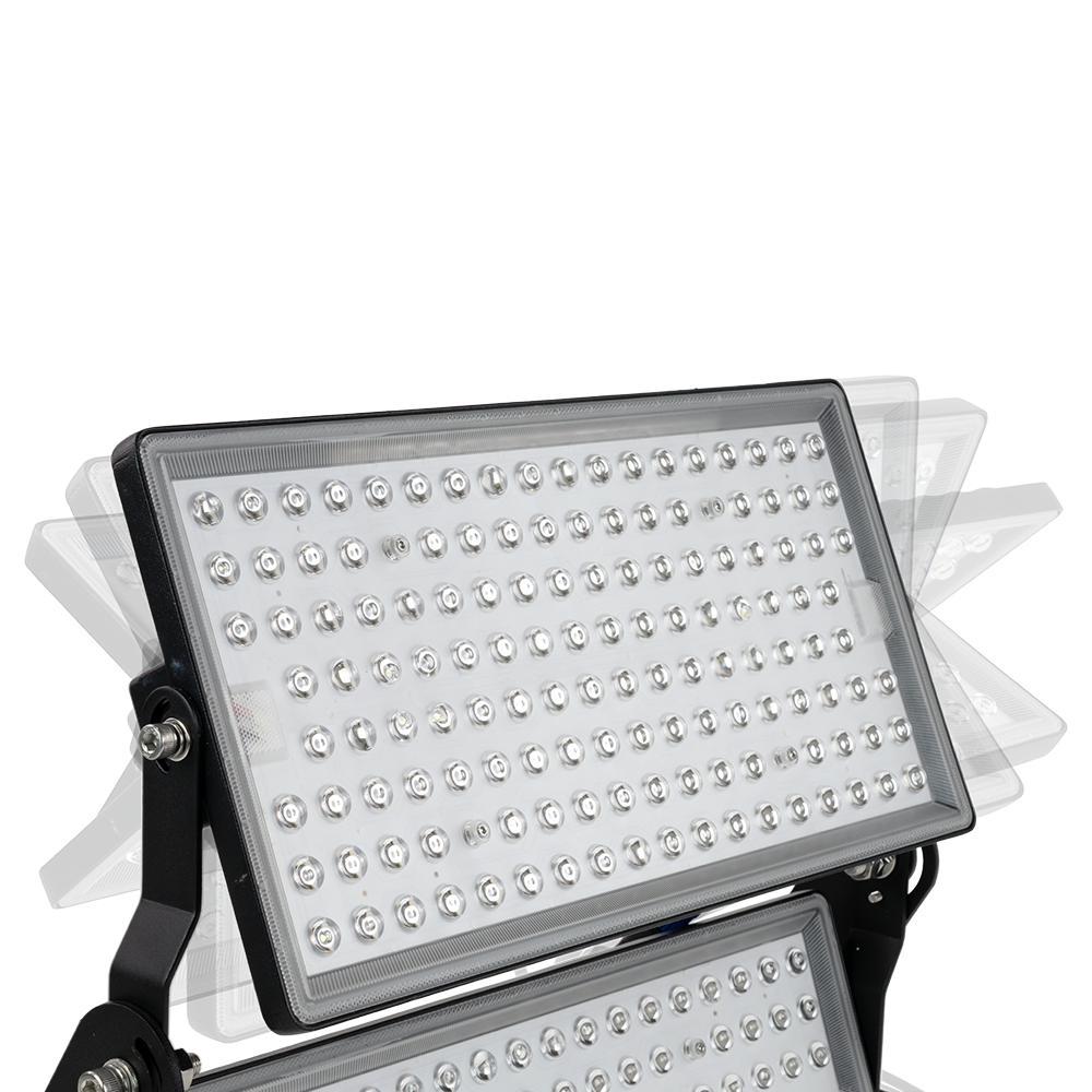- Maximale Lichtleistung: Zwei LED-Panels liefern 500 W und 67500 Lumen – ideal für Sportplätze, Baustellen, Lagerhallen und Veranstaltungen.