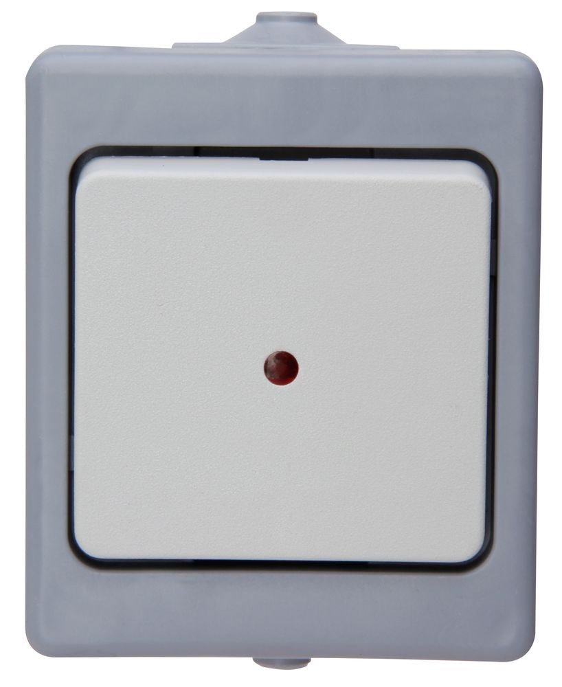 Der Aufputz-Kontrollschalter (Aus-/Wechselschalter) aus der Serie STANDARD verfügt über eine Linse mit eingesetzter Glimmlampe. Die Nennspannung beträgt 250 VAC bei 10 A Bemessungsstrom.
