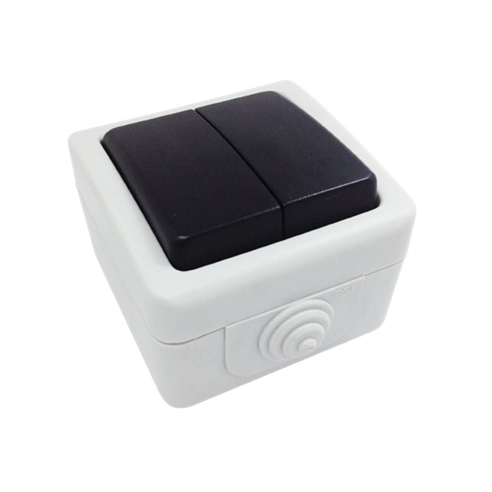 Schalter mit zwei Wippen mit einem Nennstrom von 10 A und einer Nennspannung von 250 V in der Farbe weiß.