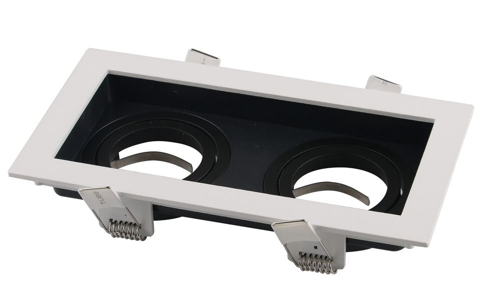 Schwenkbarer Einbaurahmen aus Aluminium für zwei GU10 oder MR16 Leuchtmittel in den Farben schwarz und weiß. Der Einbaurahmen verfügt über einen Einbaudurchmesser von 90 mm.