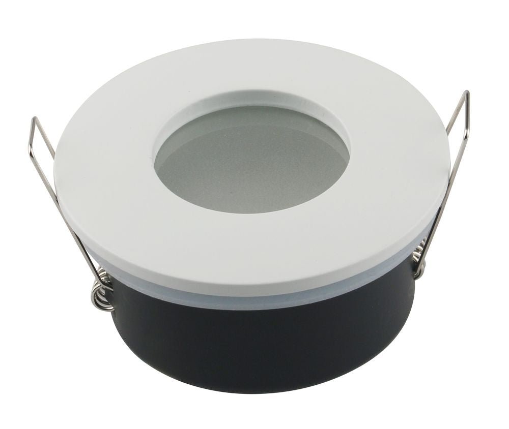 Runder Einbaurahmen mit IP65-Zertifizierung aus Aluminium für GU10 und MR16 Leuchtmittel in der Farbe weiß. Der Einbaurahmen verfügt über einen Einbaudurchmesser von 70 mm.