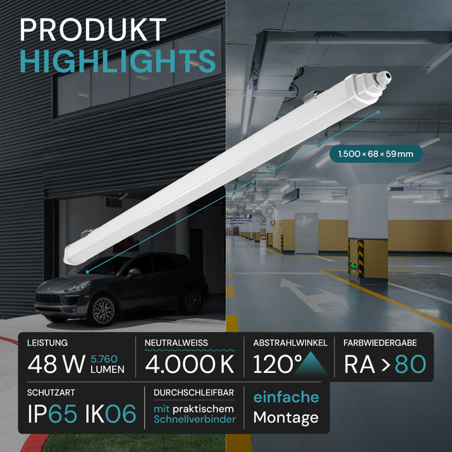 LED Feuchtraumleuchte mit einer Länge von 150 cm, 48 W Leistung, 5760 Lumen, 4000 K (neutralweiß), IP65 staub- und wassergeschützt, durchschleifbar, schnelle und unkomplizierte Montage.