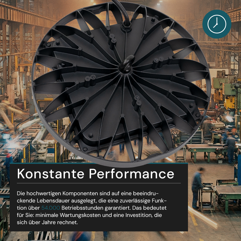 Dieses Produkt ist auch geeignet als: Industrielampe, Hallenbeleuchtung, Industriestrahler, Hallenleuchte, Werkstattlampe, Werkstattleuchte, Industrieleuchte, Highbay, Hallenstrahler, Hallentiefstrahler, UFO Lampe