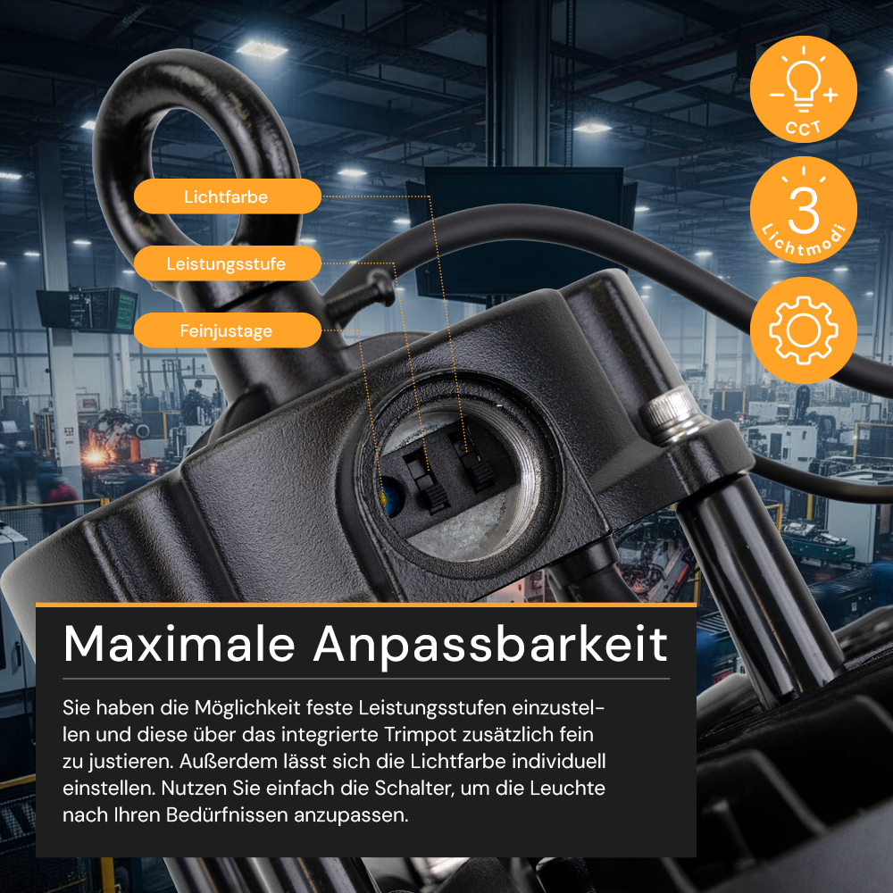 - Anpassbare Leistung: Passen Sie die Leistung der Hallenleuchte einfach an Ihren Beleuchtungsbedarf an. Mittels des in das Gehäuse integrierten Schalters lässt sich die Leistung wahlweise auf 100, 150 oder 200 W einstellen, um die gewünschte Helligkeit und Energieeinsparung zu erzielen.