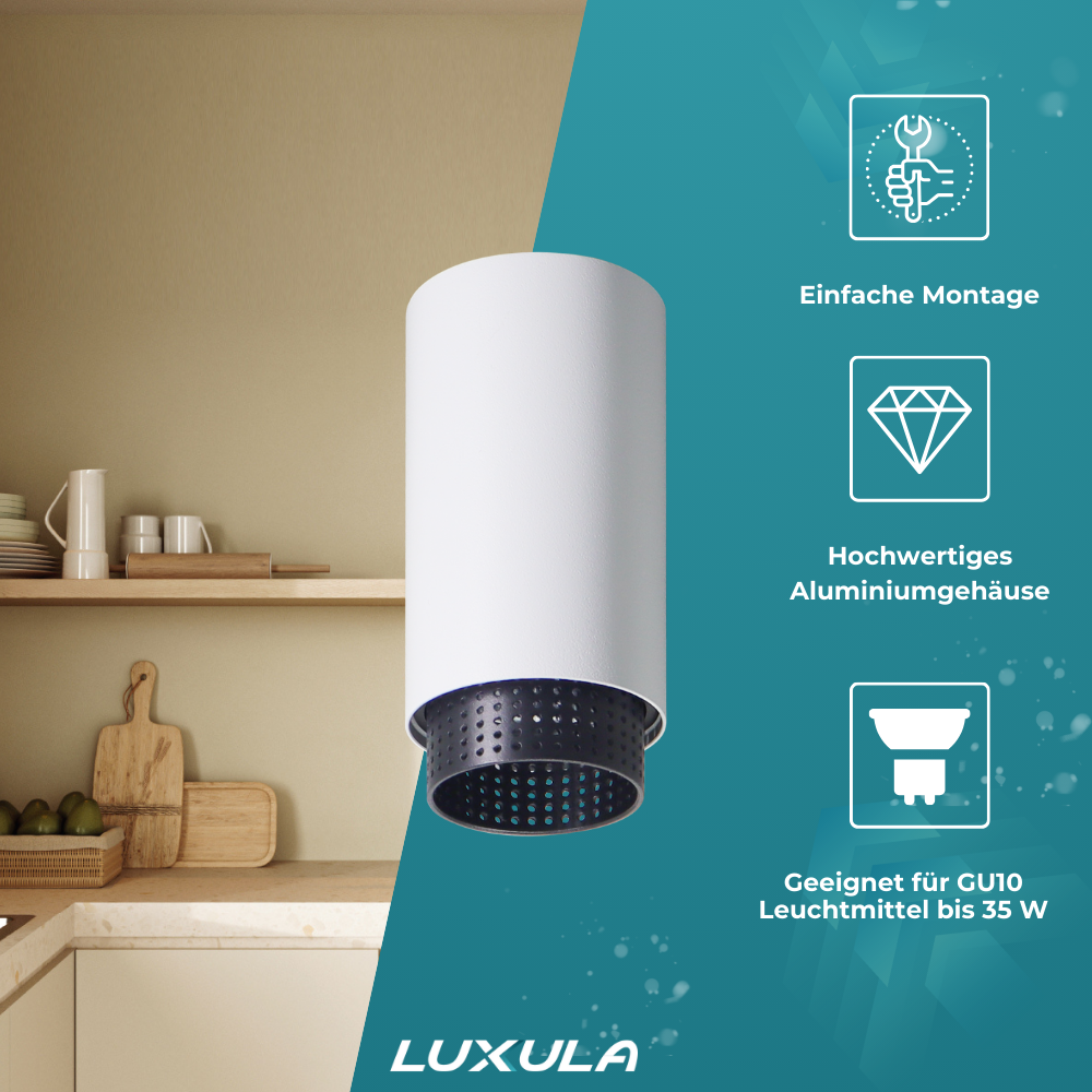 Der LUXULA LED-Aufbauspot besticht durch seine einzigartige Kombination aus minimalistischer Form und durchdachten Details. Der perforierte Innenring in Schwarz oder Gold verleiht der Leuchte eine zusätzliche Designnote und sorgt für eine subtile Lichtstreuung, die das Ambiente eines Raumes aufwertet. Die hochwertigen Materialien aus Aluminium garantieren eine lange Lebensdauer und eine pflegeleichte Oberfläche.