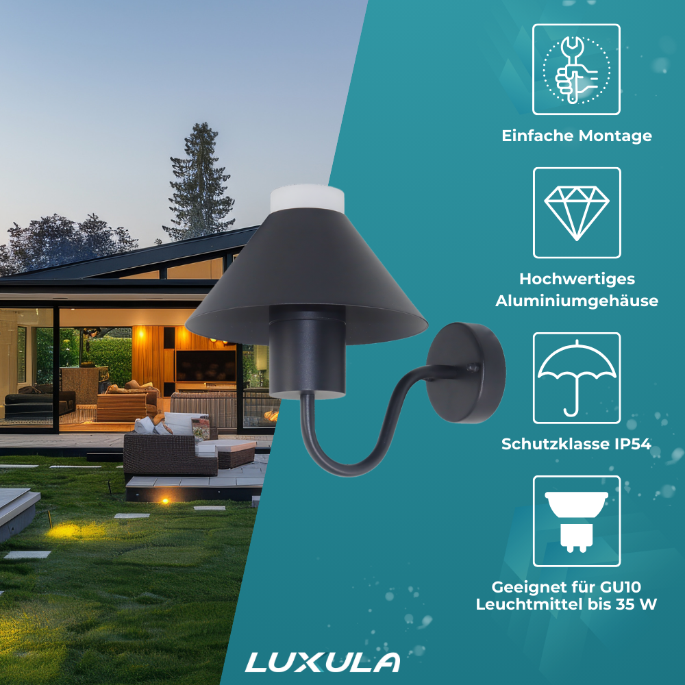 Die LUXULA Wandleuchte ist mit einer GU10 Fassung ausgestattet, die mit zahlreichen Leuchtmitteln kompatibel ist – von energiesparenden LEDs bis hin zu dekorativen Filamentlampen. Sie bietet Flexibilität in der Lichtgestaltung und ermöglicht es Ihnen, die Lichtstimmung individuell anzupassen. Ob als stimmungsvolle Beleuchtung im Wohnzimmer oder als funktionale Außenleuchte, die Wandleuchte passt sich mühelos jeder Umgebung an.