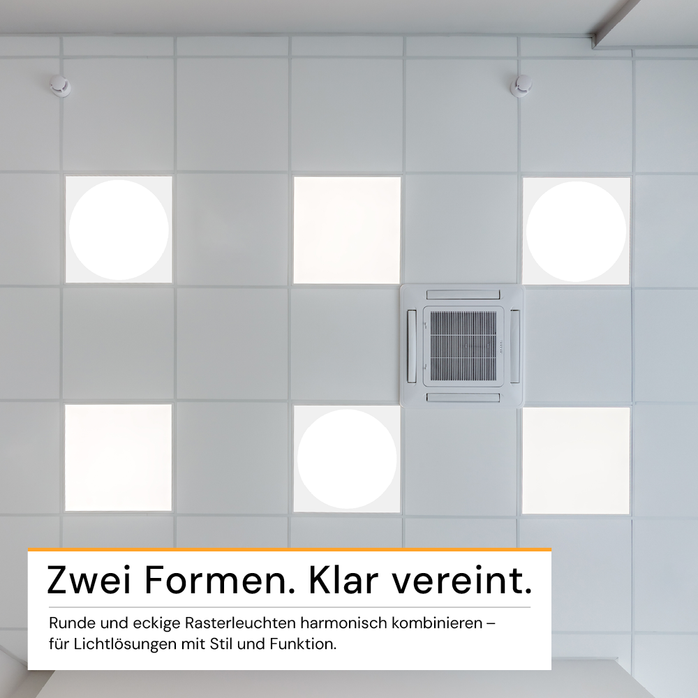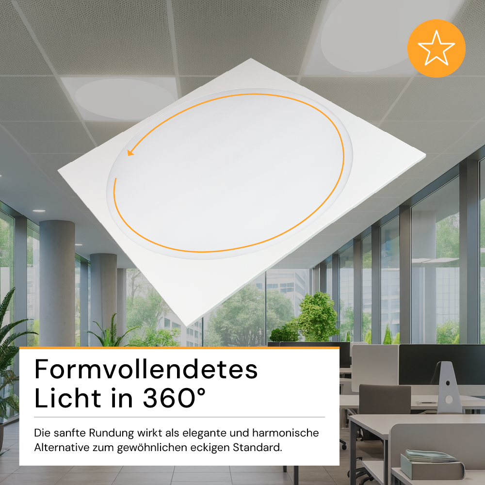 - Einzigartiges, elegantes Design: Die runde Lichtfläche in quadratischem Gehäuse verleiht dem Raum ein modernes, stilvolles Ambiente. Ob in 62x62 cm Rasterdecken oder als Aufbauleuchte in Kombination mit separat erhältlichen Aufbaurahmen - das LED-Panel setzt unvergleichbare Beleuchtungsakzente.