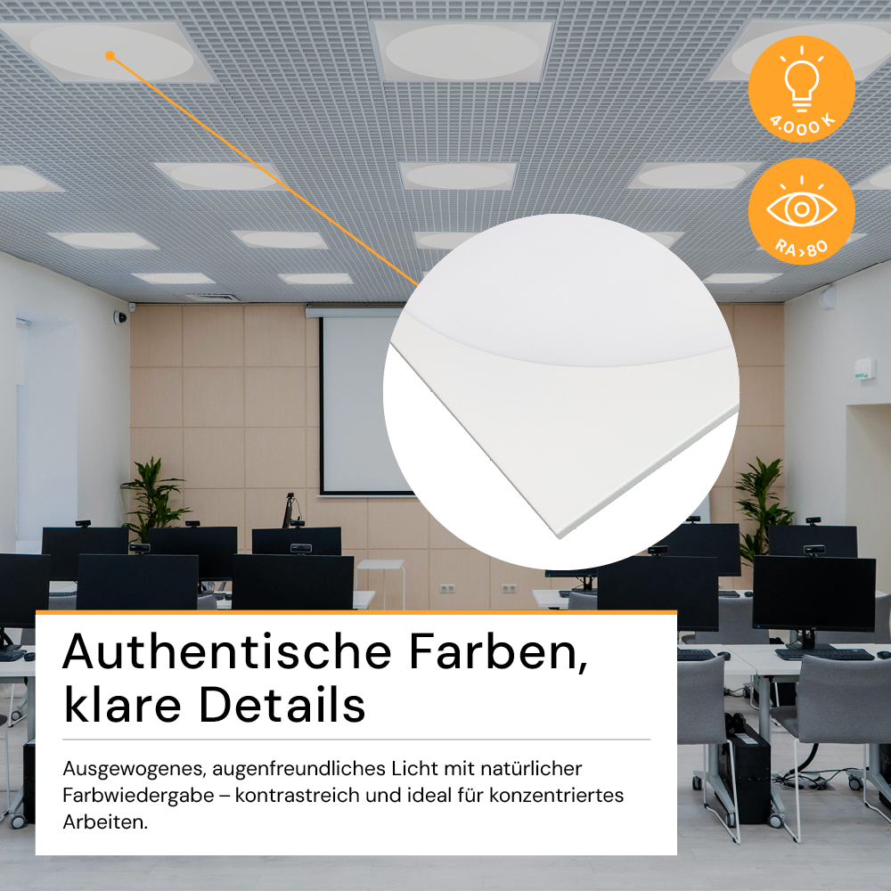 - Augenschonend & angenehm: Mit einem UGR-Wert von 22 und einer Lichtfarbe von 4000 K (neutralweiß) bietet das Panel blendfreies Licht für konzentriertes Arbeiten.
