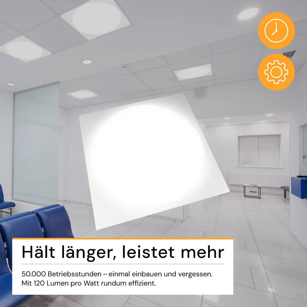 - Starke Lichtleistung bei hoher Effizienz: 30 Watt Leistung mit 3.600 Lumen (120 lm/W) sorgen für eine helle und gleichmäßige Ausleuchtung – ideal für Büros, Praxen oder Besprechungsräume.