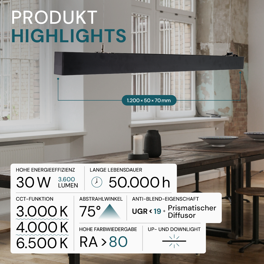Mit einer Länge von 120 cm und einem Premium-Netzteil von LIFUD sorgt sie für eine leistungsstarke, gleichmäßige Beleuchtung, die dank des einstellbaren Lichtfarbtons (warmweiß, neutralweiß oder kaltweiß) individuell an jede Umgebung und Stimmung angepasst werden kann. Die niedrige Blendung (UGR <19) unterstützt ein angenehmes, augenschonendes Arbeiten und ist damit besonders geeignet für Büroarbeitsplätze und andere professionelle Umgebungen. Mit einer Leistung von 30W und einer hohen Energieeffizienz von 120 lm pro Watt ist die LED Leuchte ein echter Stromsparer und umweltfreundlich. Die lange Lebensdauer von 50.000 Stunden bedeutet, dass Sie viele Jahre wartungsfreien Einsatz genießen können.