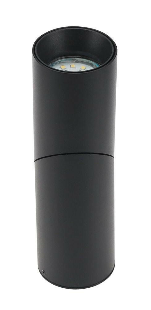Mittig schwenkbarer, runder Aufbauspot aus Aluminium für GU10 oder MR16 Leuchtmittel in der Farbe schwarz.