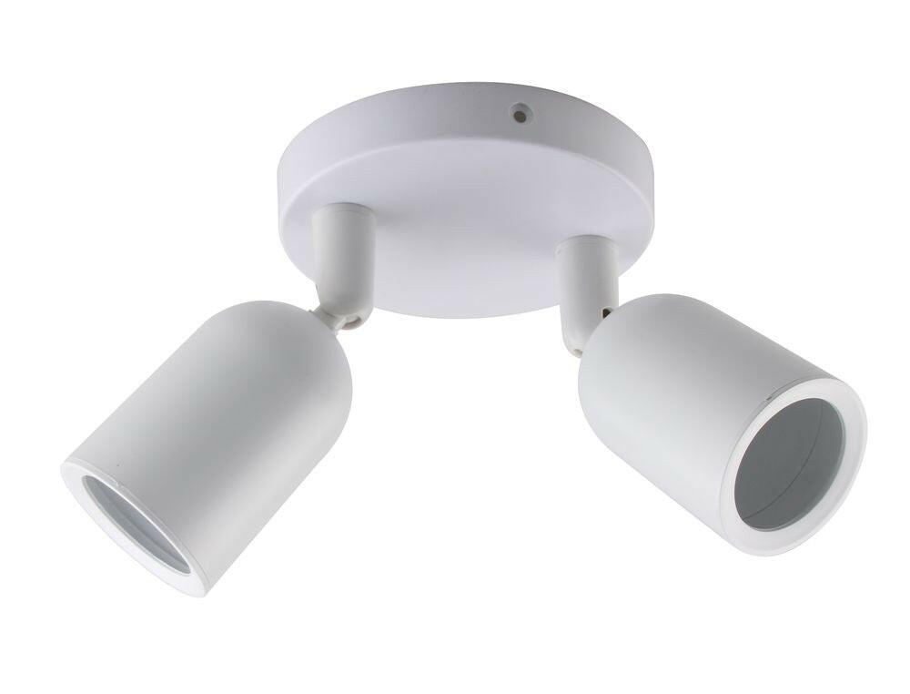 Schwenkbarer, runder Deckenaufbaustrahler aus Kunststoff für 2 x GU10 oder MR16 Leuchtmittel mit max. 10 Watt Leistung in der Farbe weiß.