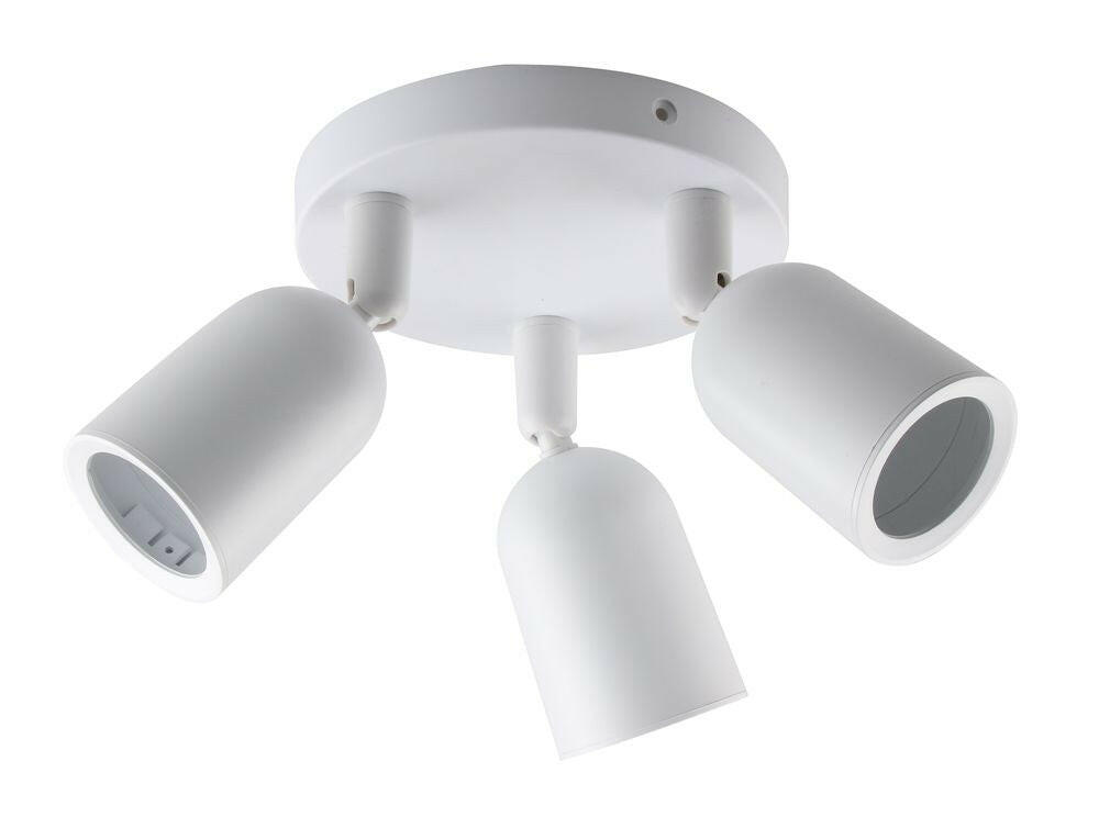 Schwenkbarer, runder Deckenaufbaustrahler aus Kunststoff für 3 x GU10 oder MR16 Leuchtmittel mit max. 10 Watt Leistung in der Farbe weiß.