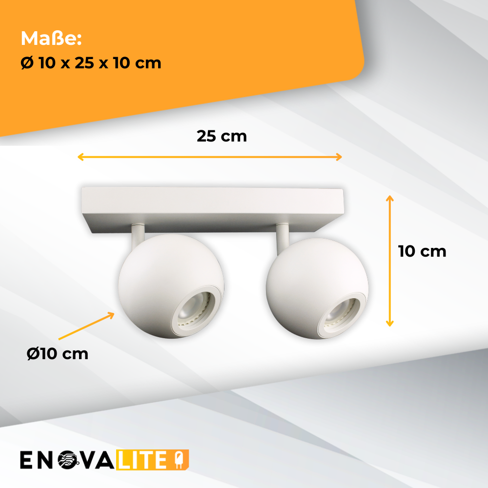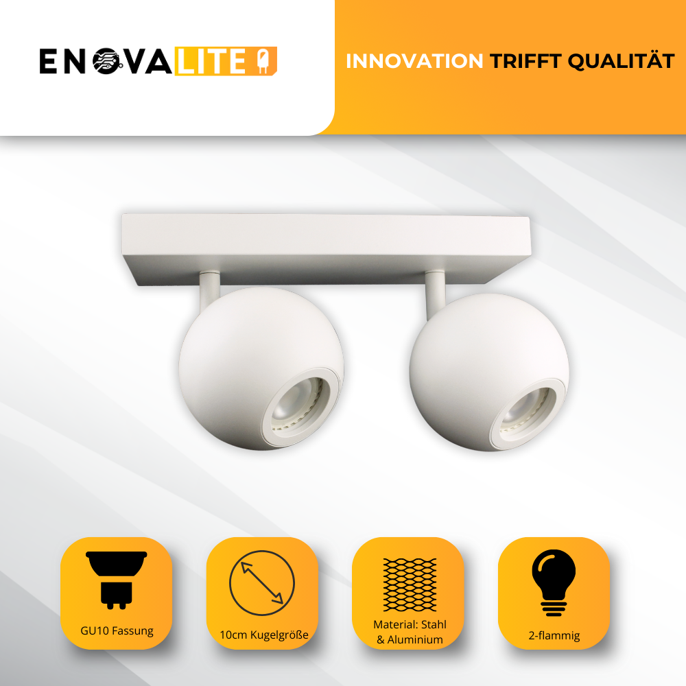 Der 2-flammige LED-Deckenspot der Serie GLOBE von ENOVALITE kombiniert Stil und Funktionalität in einem modernen Design. Aus hochwertigem Aluminium gefertigt, bietet diese Leuchte nicht nur Langlebigkeit, sondern auch eine ansprechende Optik. Mit einer GU10-Fassung ist sie einfach mit verschiedenen LED-Leuchtmitteln zu bestücken, sodass Sie das Licht an Ihre Bedürfnisse anpassen können. Die Spots lassen sich individuell ausrichten, um eine optimale Ausleuchtung Ihrer Räume zu gewährleisten – ideal für Wohnzimmer, Küchen, Flure und Büros.