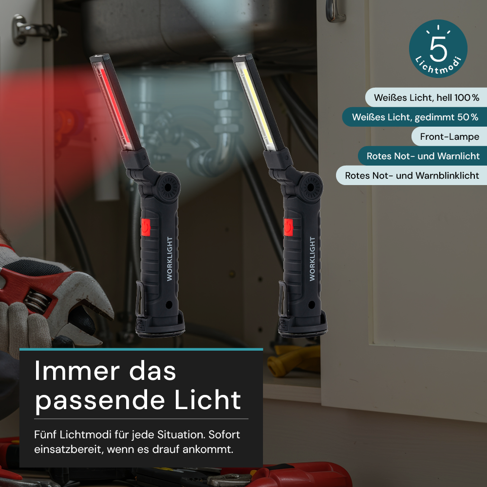 Die Arbeitsleuchte ist die perfekte Lichtlösung für alle, die auch unter schwierigen Bedingungen zuverlässig sehen möchten. Ob beim Schrauben am Auto, in der Werkstatt, bei Outdoor-Einsätzen oder im Notfall – diese wiederaufladbare Akku-Leuchte mit durchdachtem Design bietet maximale Flexibilität und Leistung in jeder Situation. 5 Lichtmodi für jede Situation. Ob Flutlicht oder fokussierter Spot – mit nur einem Knopfdruck ist die Leuchte sofort einsatzbereit, wenn es darauf ankommt.