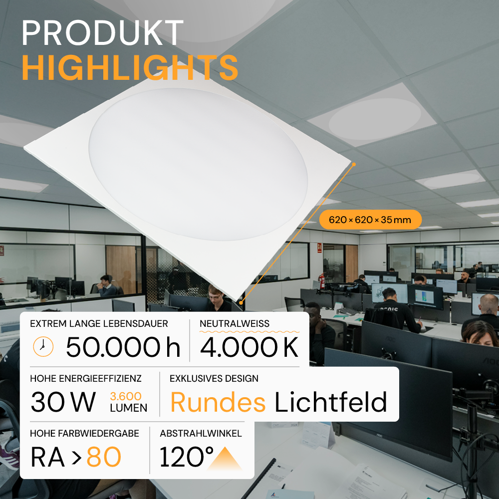 - Starke Lichtleistung bei hoher Effizienz: 30 Watt Leistung mit 3.600 Lumen (120 lm/W) sorgen für eine helle und gleichmäßige Ausleuchtung – ideal für Büros, Praxen oder Besprechungsräume.