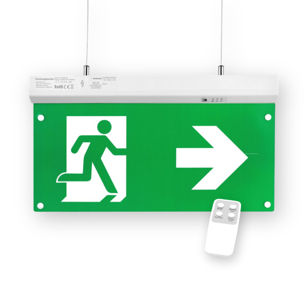- 4 austauschbare Piktogramme (Notausgang links, Notausgang rechts, Notausgang geradeaus, Notausgang runter)
