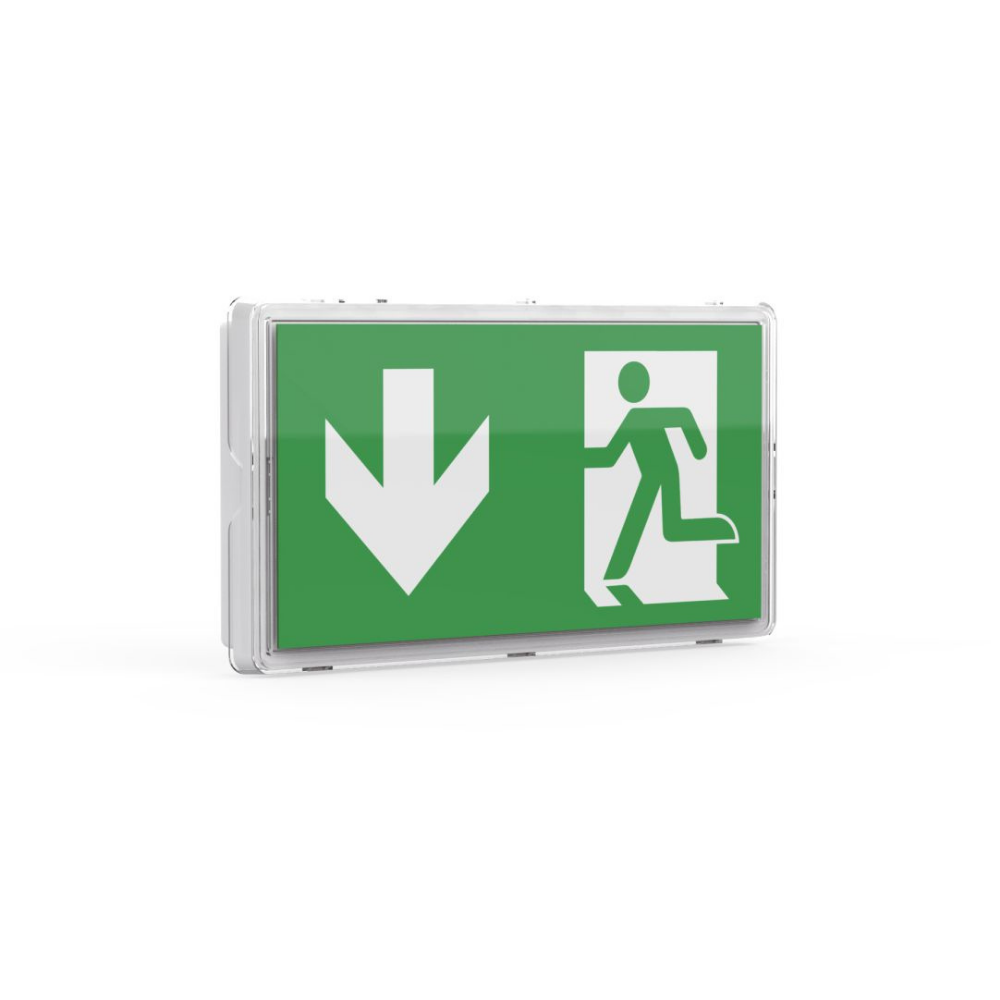 - 4 austauschbare Piktogramme (Notausgang links, Notausgang rechts, Notausgang geradeaus, Notausgang runter)