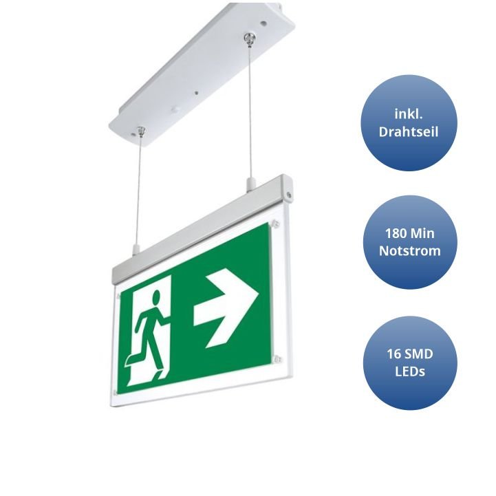 - inklusive 4 Piktogrammen (Notausgang links, Notausgang rechts, Notausgang geradeaus, EXIT)