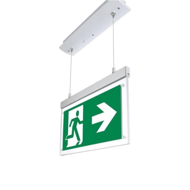LED Fluchtweg-Leuchte für die Deckenmontage mit hängendem Anzeigeschild und integriertem Notstromakku