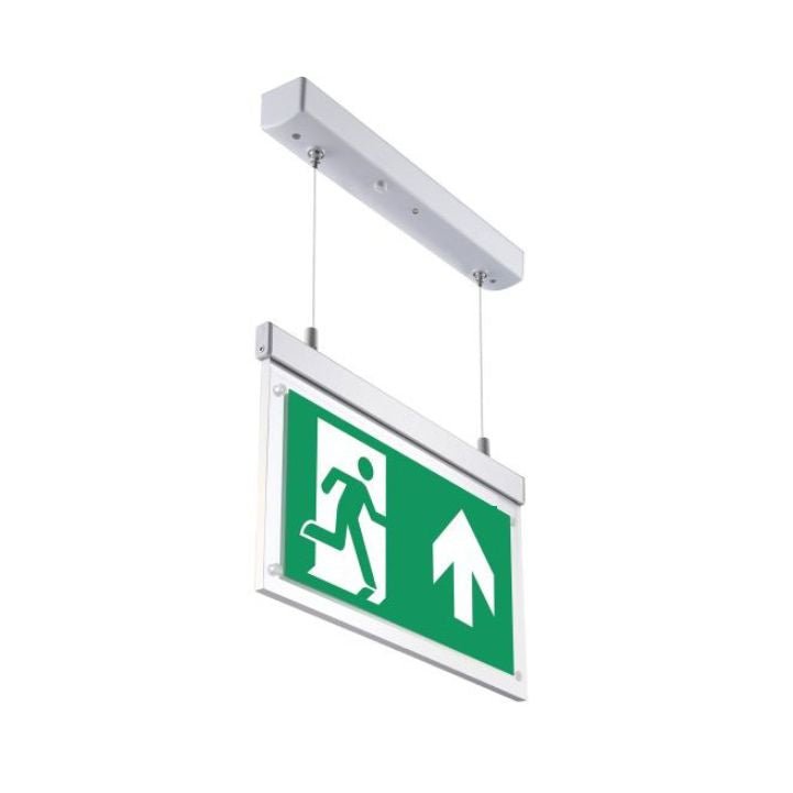LED Fluchtweg-Leuchte für die Deckenmontage mit hängendem Anzeigeschild und integriertem Notstromakku