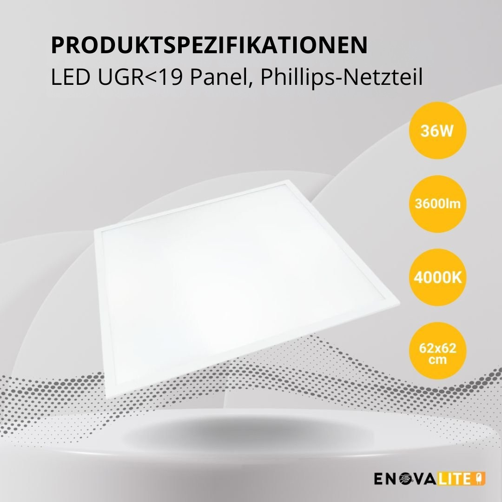Das 62 x 62 cm große LED Panel von ENOVA LITE ist mit einem hochwertigen Philips Netzteil ausgestattet. Es ist somit die perfekte Lösung für ihre Beleuchtungsansprüche im gewerblichen, sowie im privaten Gebrauch.