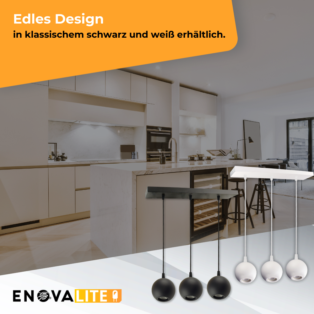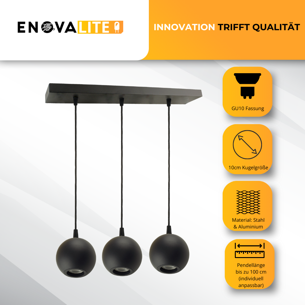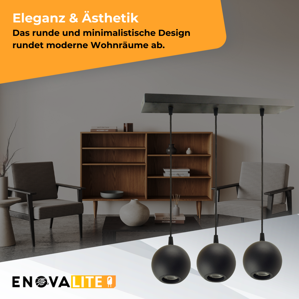 Die LED-Pendelleuchte der Serie GLOBE von ENOVALITE verleiht jedem Raum eine stilvolle, moderne Note. Mit ihrer hochwertigen Verarbeitung aus Aluminium und dem runden, zeitlosen Design fügt sie sich nahtlos in Wohn-, Esszimmer oder auch Büroumgebungen ein. Die 3 GU10-Fassungen bieten Ihnen die Flexibilität, individuelle Leuchtmittel zu wählen, um die gewünschte Lichtintensität und Farbtemperatur zu erzielen. Dank der anpassbaren Pendellänge bis zu 100 cm lässt sich die Leuchte optimal in verschiedenen Raumhöhen installieren und wirkt sowohl über Esstischen als auch in offenen Wohnbereichen besonders edel.
