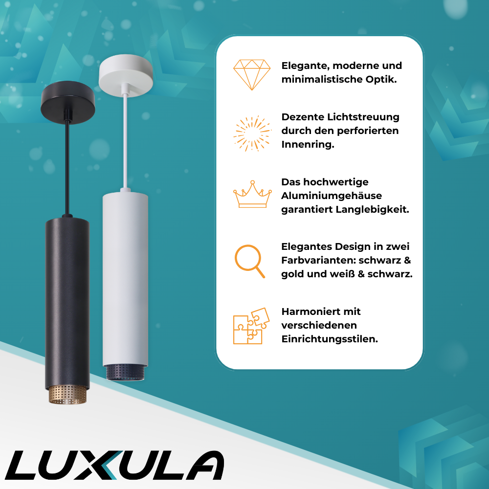 Die LED-Pendelleuchte von LUXULA kombiniert minimalistisches Design mit hochwertiger Verarbeitung und flexiblen Einsatzmöglichkeiten. Erhältlich in zwei eleganten Farbvarianten – Schwarz mit goldenem Akzent und Weiß mit schwarzem Akzent – ist diese Leuchte der perfekte Hingucker für Wohnräume, Esszimmer oder Büros.