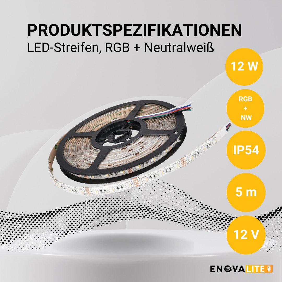 LED-Streifen, RGB und neutralweißes Licht, 5 Meter Länge, IP54, 60LED/m, 12 V, 10 mm