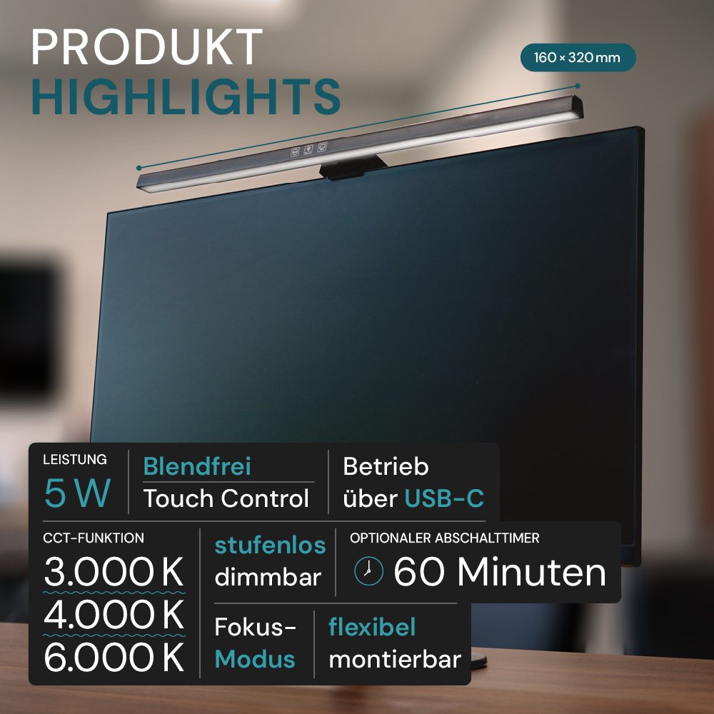 Dieses Produkt ist auch geeignet als: Bildschirmleuchte, Monitorlicht, Tischleuchte mit USB, Clip-Lampe, Arbeitsplatzbeleuchtung, Leselampe, Lichtleiste für PC oder Laptop, Gaming-Licht, LED-Schreibtischlampe mit Touch-Dimmer.