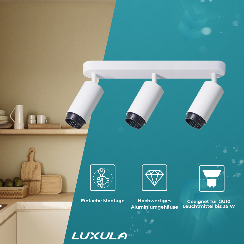 Die 3-flammige Variante des schwenkbaren LED-Aufbauspots von LUXULA vereint modernes Design mit vielseitiger Funktionalität. Diese elegante Leuchte, erhältlich in den stilvollen Farbvarianten Weiß mit schwarzem Akzent oder Schwarz mit goldenem Akzent, sorgt für eine optimale Beleuchtung und passt perfekt in Wohnräume, Flure oder Büros. Die schwenkbaren Köpfe machen sie besonders flexibel für Ihre Lichtgestaltung.