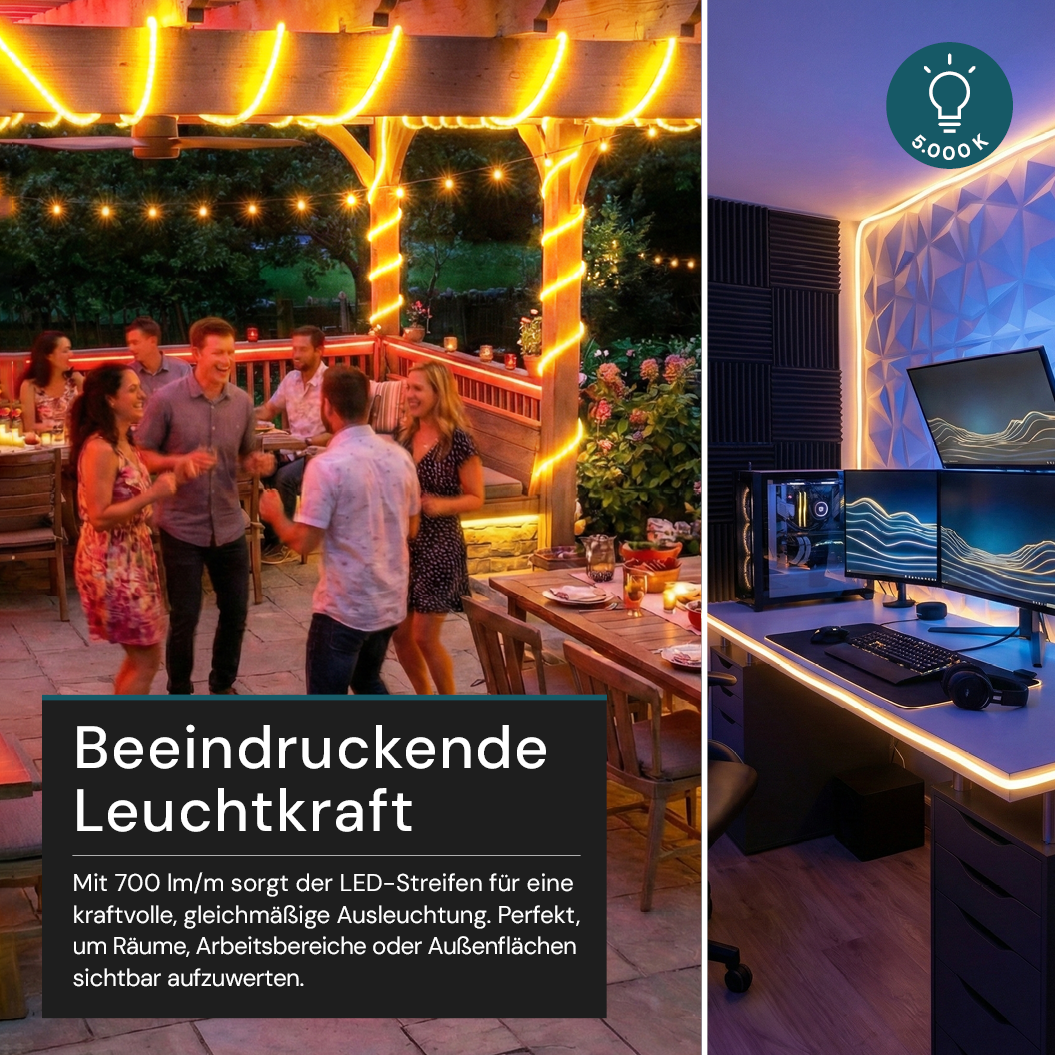 - Lange Lichtlinien: 50-Meter-Rolle, mit Verbinder erweiterbar – ideal für durchgehende Projekte bis 70 m.