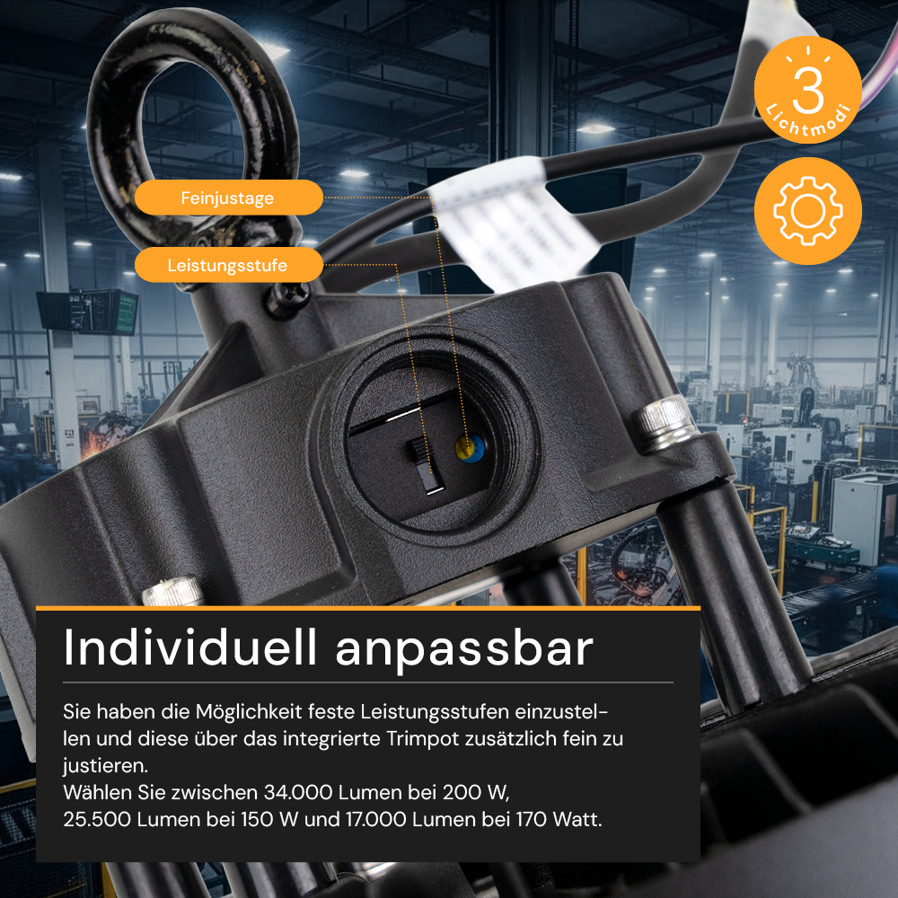 LED-Hallenstrahler, UFO, Leistung einstellbar, 100/150/200W, 4000 K (neutralweiß), 17000-34000 lm, IP65, LIFUD, 0-10V dimmbar, 3-in-1 Leuchte, hohe Energieeffizienz LED-Hallenstrahler, UFO, anpassbare Leistung, 100-200 W, 4000 K (neutralweiß), 17000-34000 lm, IP65, LIFUD, dimmbar, 3-in-1 Leuchte, hohe Energieeffizienz  Anpassbare Leistung: Passen Sie die Leistung der Hallenleuchte einfach an Ihren Beleuchtungsbedarf an. Mittels des in das Gehäuse integrierten Schalters lässt sich die Leistung wahlweise auf 100, 150 oder 200 W einstellen, um die gewünschte Helligkeit und Energieeinsparung zu erzielen. Dimmfunktion mit Feinjustierung:  Die 0-10V Dimmfunktion mit integrierter Feinjustierung ermöglicht eine stufenlose und exakte Anpassung der Lichtintensität. Hohe Energieeffizienz: Mit einem beeindruckenden Wirkungsgrad und einer Helligkeit von bis zu 34.000 Lumen sorgt diese Leuchte für eine optimale Ausleuchtung bei minimalem Energieverbrauch. Vielseitige Anwendung: Die ENOVALITE UFO-Leuchte ist IP65-zertifiziert und somit wasser- und staubgeschützt. Sie eignet sich ideal für den Einsatz in Lagerhallen, Fabriken, Sporthallen und anderen industriellen Bereichen. Dieser LED Hallenstrahler von ENOVALITE ist nicht nur robust und langlebig, sondern auch extrem flexibel. Durch die anpassbare Leistung (100, 150 oder 200 W) können Sie die Helligkeit und den Energieverbrauch je nach Bedarf regulieren, was ihn ideal für verschiedenste Anwendungen macht, sei es in Lagerhallen, Produktionsstätten, Sporthallen oder Außenbereichen. Mit der 0-10 V Dimmfunktion können Sie die Helligkeit ganz einfach regulieren, um Energie zu sparen und gleichzeitig die perfekte Helligkeit zu schaffen. Zudem verfügt der Strahler über eine Feinjustierung für die Dimmfunktion, die es Ihnen ermöglicht, die Lichtintensität noch genauer auf Ihre Bedürfnisse abzustimmen. Egal, ob Sie eine angenehme Grundbeleuchtung oder maximale Helligkeit für detailreiche Arbeiten benötigen – mit der präzisen Regelung können Sie das Licht und exakt anpassen. Diese Funktion macht den Strahler besonders flexibel und sorgt in jedem Einsatzbereich, von Lagerhallen bis hin zu Sportstätten, für ideale Lichtverhältnisse und maximalen Komfort. Der Strahler ist mit einem hochwertigen LIFUD Treiber ausgestattet, der für eine stabile und langlebige Leistung sorgt.Die neutrale Lichtfarbe von 4000 K sorgt für eine angenehme und gleichmäßige Ausleuchtung, die Augenfreundlichkeit und Konzentrationsfähigkeit fördert. Mit einer hohen Lichtausbeute von bis zu 34.000 Lumen können Sie sicher sein, dass auch große Flächen effektiv beleuchtet werden. Dank der IP65-Schutzklasse ist der ENOVALITE Hallenstrahler gegen Staub und Wasser geschützt, was seine Einsatzmöglichkeiten erheblich erweitert. Ob in feuchten oder staubigen Umgebungen – dieser Strahler hält den härtesten Bedingungen stand. Darüber hinaus bietet die dimmbare Funktion und einstellbare Leistung weitere Flexibilität bei der Lichtsteuerung und macht die Highbay zu einem echten Allroundtalent.Passendes Zubehör zum Produkt:LX900500 - Metallkette zum Aufhängen, 100 cm, Ø4.8 mm, max. 40 kg, KorrosionsgeschütztLX900501 - Karabinerhaken zum Aufhängen, Ø6.5x71x33.5 mm, max. 40 kg, KorrosionsgeschütztLX900502 - Deckenhaken zum Aufhängen, Ø74 mm, max. 40 kg, KorrosionsgeschütztDieses Produkt ist auch geeignet als: Industrielampe, Hallen, Industriestrahler, Hallenleuchte, Werkstattlampe, Werkstattleuchte, Werkstattbeleuchtung LED, UFO LED, Hallenbeleuchtung, LED Hallenlampe, UFO Lampe, LED Hallenstrahler, Garagenlampe LED, Werkstatt Deckenleuchte, LED Industrielampe, HighBay, Deckenstrahler, Hallenstrahler, Industrielicht.