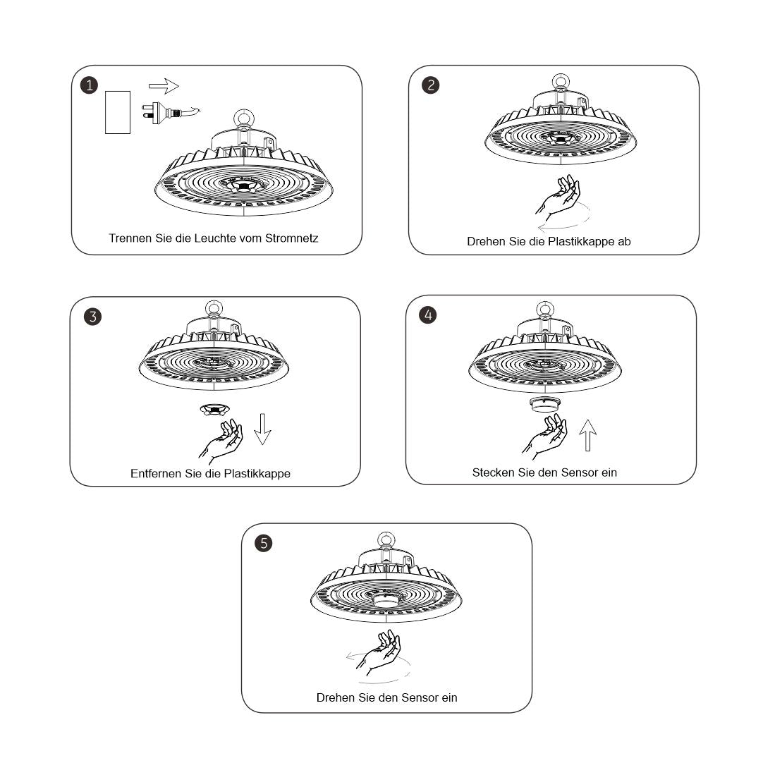 Sind in Ihrer Halle mehrere UFO HighBays montiert, schaltet sich die Beleuchtung erst ein, wenn der Sensor eine Bewegung registriert. So entsteht ein großes Einsparungspotential der Energiekosten. Der Sensor ist vom Plug-and-Play-Typ, d.h. er lässt sich ganz einfach und ohne Werkzeug an der dafür vorgesehenen Vorrichtung montieren. Der Sensor lässt sich somit ohne Aufwand leicht austauschen oder aufrüsten.