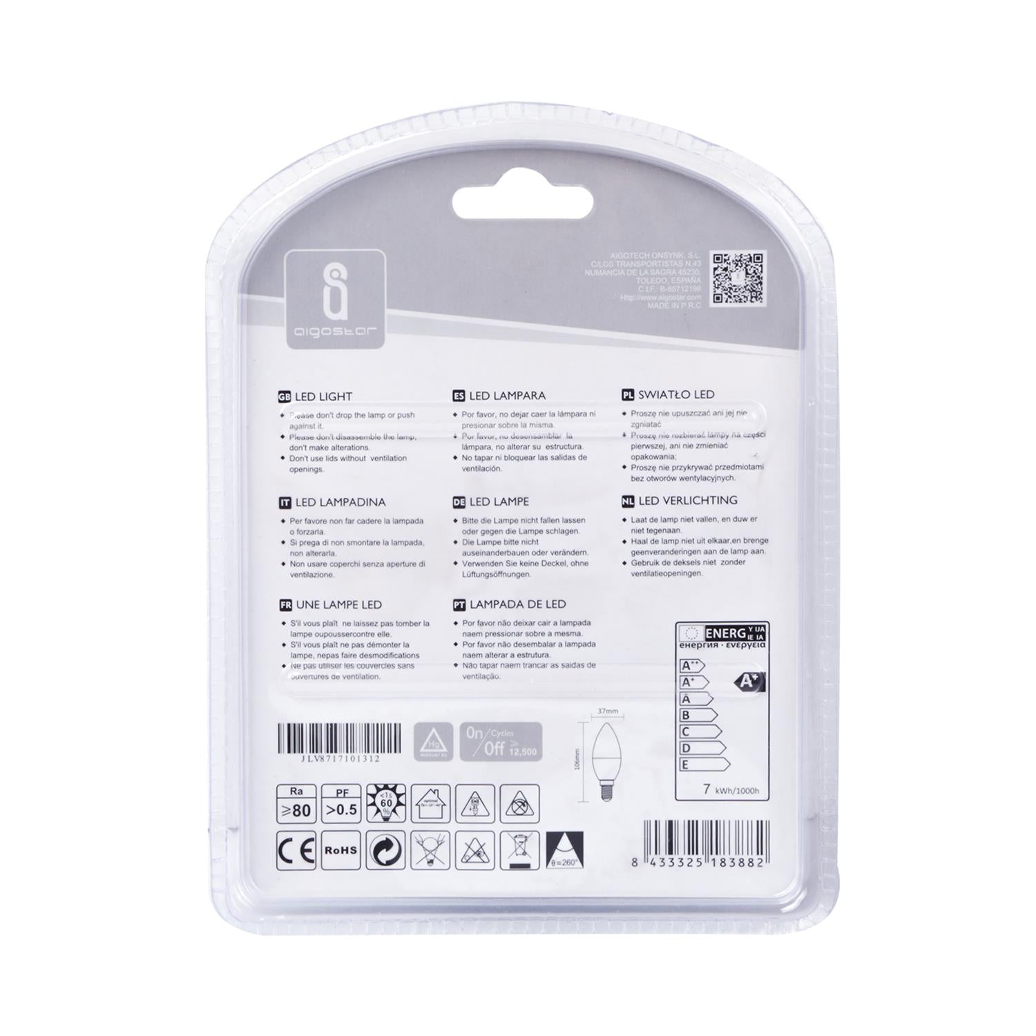 LED Leuchtmittel mit einem E14 Sockel, 7 Watt Leistung, einem Lichtstrom von 560 lm und in der Lichtfarbe kaltweiß (6400 K). Das LED Leuchtmittel ist sehr energieffizient. Die hochwertig verwendeten Materialien und der hohe Farbwiedergabeindex von Ra>80 stehen für eine gute Farbqualität und ein Abstrahlwinkel von 260° für eine perfekte Ausleuchtung Ihrer Räumlichkeiten.